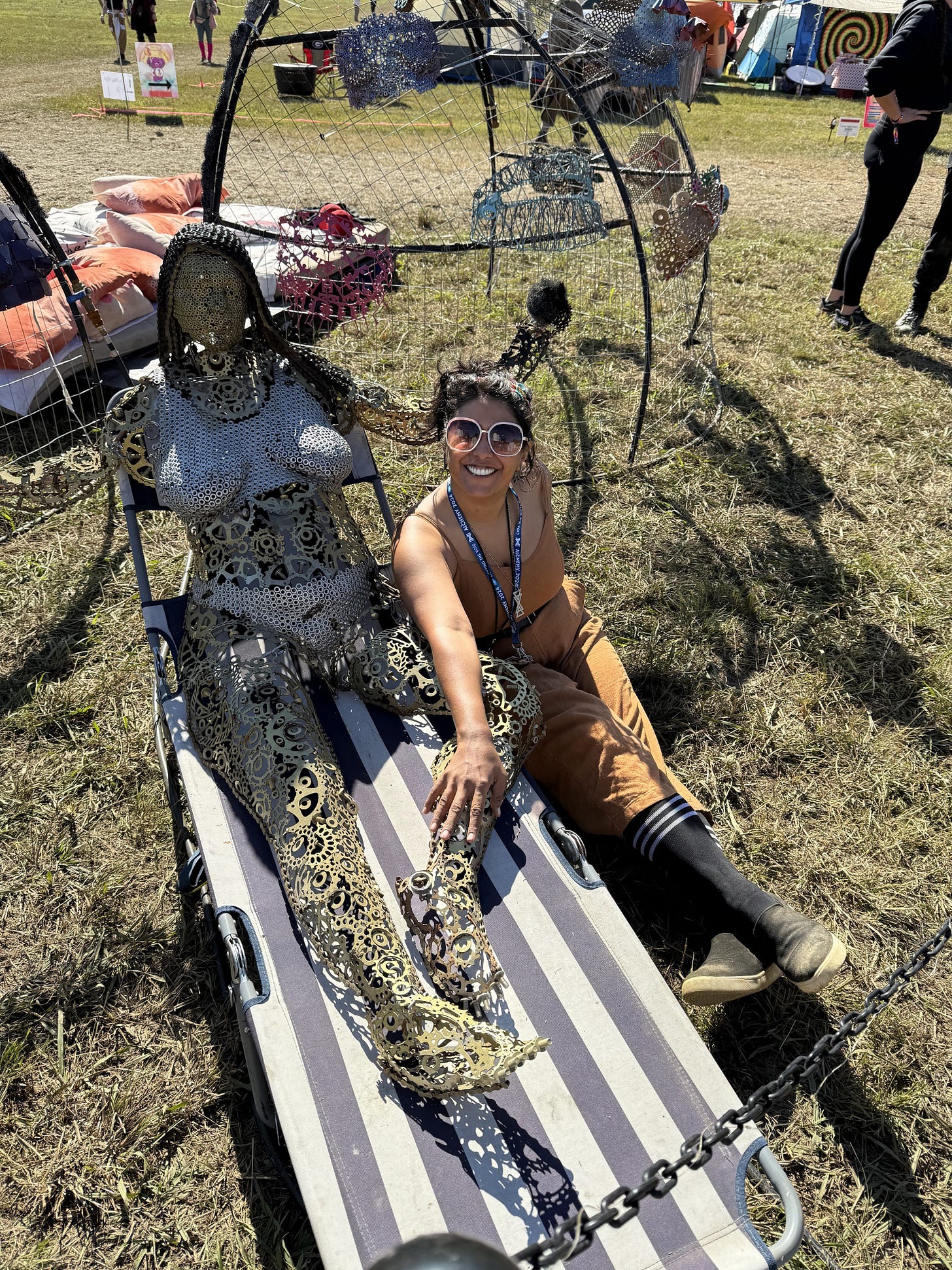 This year, in 2024, in addition to BBBbikes, I helped organize people in a shared village with the Visitors Center, another camp. I often confronted the countervailing tension between radical self-reliance and communal effort. A fellow camp mate wanted to bring a freezer camping. His gift of ice and coolness in the heat was also a feat of logistics. It was a unique problem that manifested itself as the perfect test of communal effort and radical self-reliance by working as a group, we were able to deliver this gift to our camp mates.