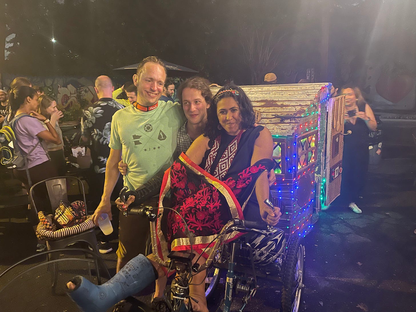 Two days after my somber June 12th birthday, I was reunited with my cycling family in an epic parade. Though I am mobility-limited, I had the best birthday celebration ever. My friend Buddy, biker, burner, and human extraordinaire, arranged an artistic disco bike carriage to cycle me along on a special edition MidWeek Roll. An enormous effort was made to keep the arrangements secret, and the results were amazing. I was astonished. That night, I saw many familiar faces on the ride and replenished my spirit with plenty of hugs at Estoria. I was constantly asked these two questions in conversation: `How is your recovery going?` followed by `How is the pain?` Every day of recovery cannot be a disco ride and parade. It has now been a full month since my accident. I am, indeed, confronting tough pains.